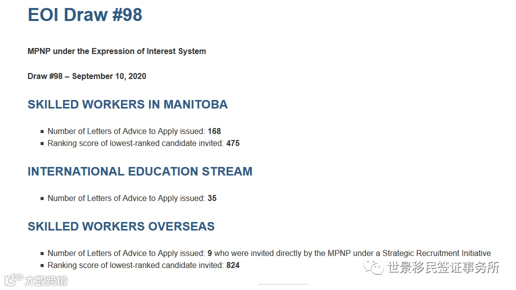 曼省发布了新的技术移民筛选结果,此次分别邀请了曼省境内申请人类别境外申请人类别以及国际毕业生类别的候选人,其中境内申请人类别最低邀请分475分,邀请人数168人;境外申请人类别最低邀请分824分,邀请人数9人;国际毕业生类别邀请人数35人。