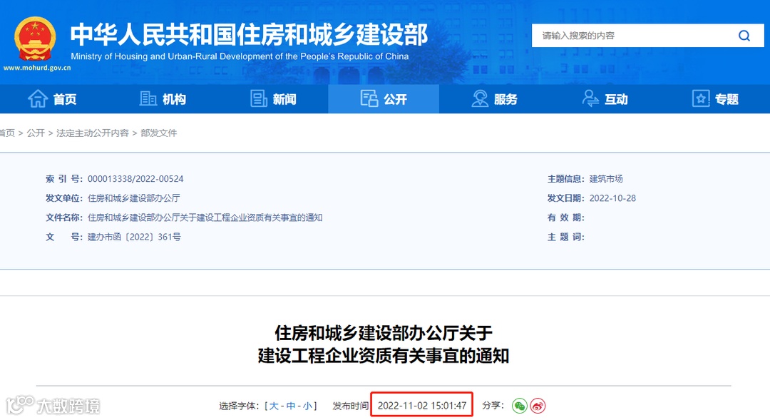 11月2日,住建部官网发布《住房和城乡建设部办公厅关于建设工程企业资质有关事宜的通知》:
