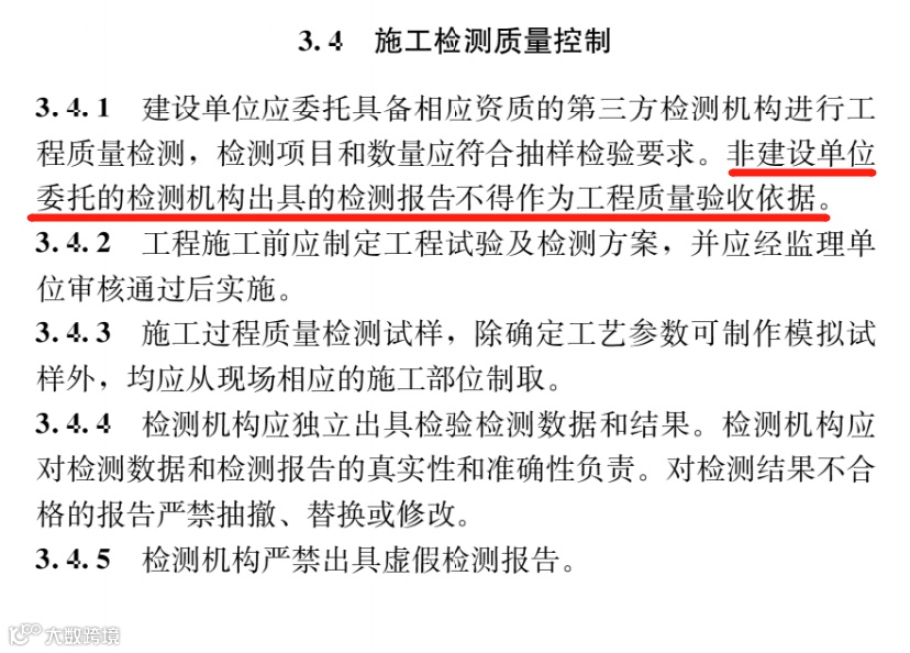 其中第3.4.1条规定:建设单位应委托具备相应资质的第三方检测机构进行工程质量检测,检测项目和数量应符合抽样检验要求。非建设单位委托的检测机构出具的检测报告不得作为工程质量验收依据。