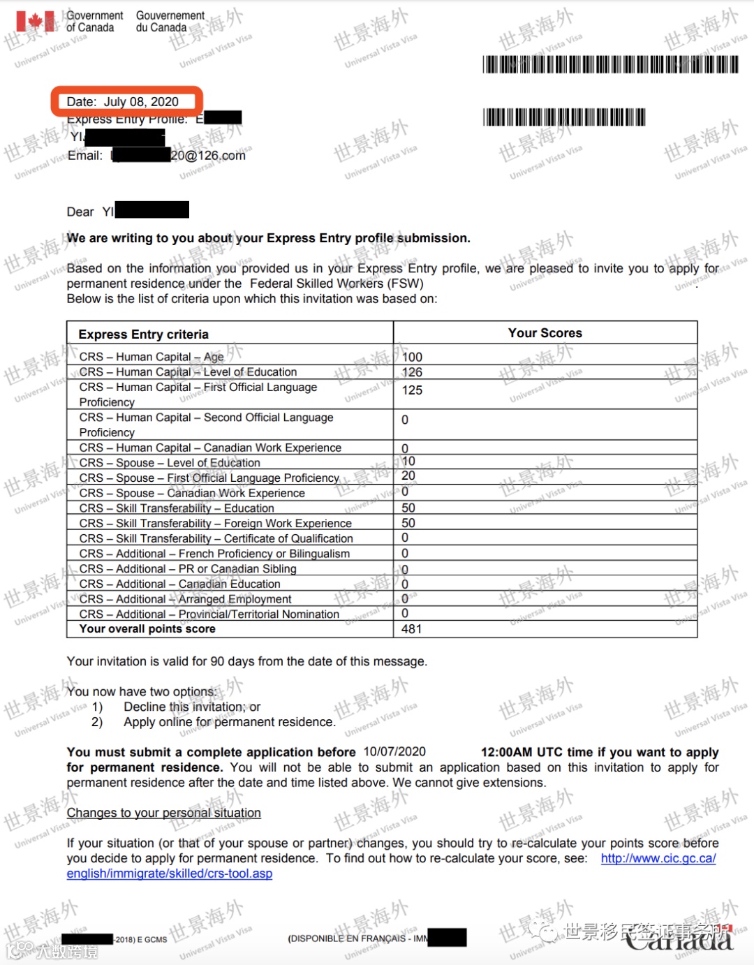 受疫情影响,3月开始联邦EE就没有邀请海外申请人,7月8日,终于联邦EE终于对海外申请人开放,最低邀请分数是478分,李先生以481分的优秀分数被获邀!