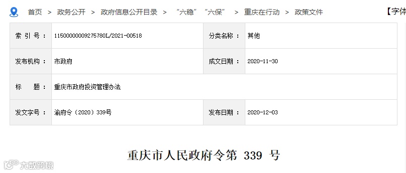 《重庆市政府投资管理办法》已经2020年11月13日市第五届人民政府第118次常务会议审议通过,现予公布,自2021年1月1日起施行。