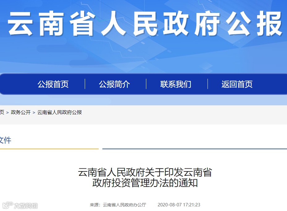 2020年8月3日,云南印发《云南省政府投资管理办法》,自2020年9月1日起施行。