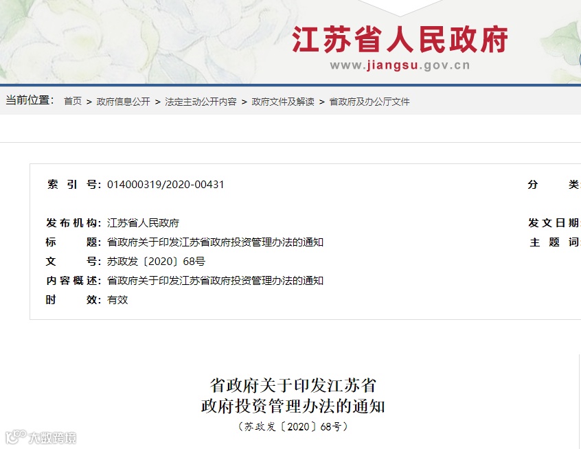 2020年8月4日,江苏省政府印发《江苏省政府投资管理办法》,自印发之日起施行。