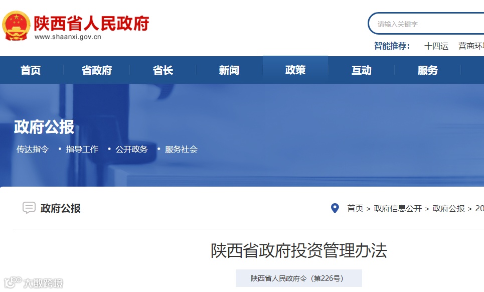 《陕西省政府投资管理办法》已经2020年10月15日省人民政府第22次常务会议审议通过,现予公布,自2020年12月1日起施行。