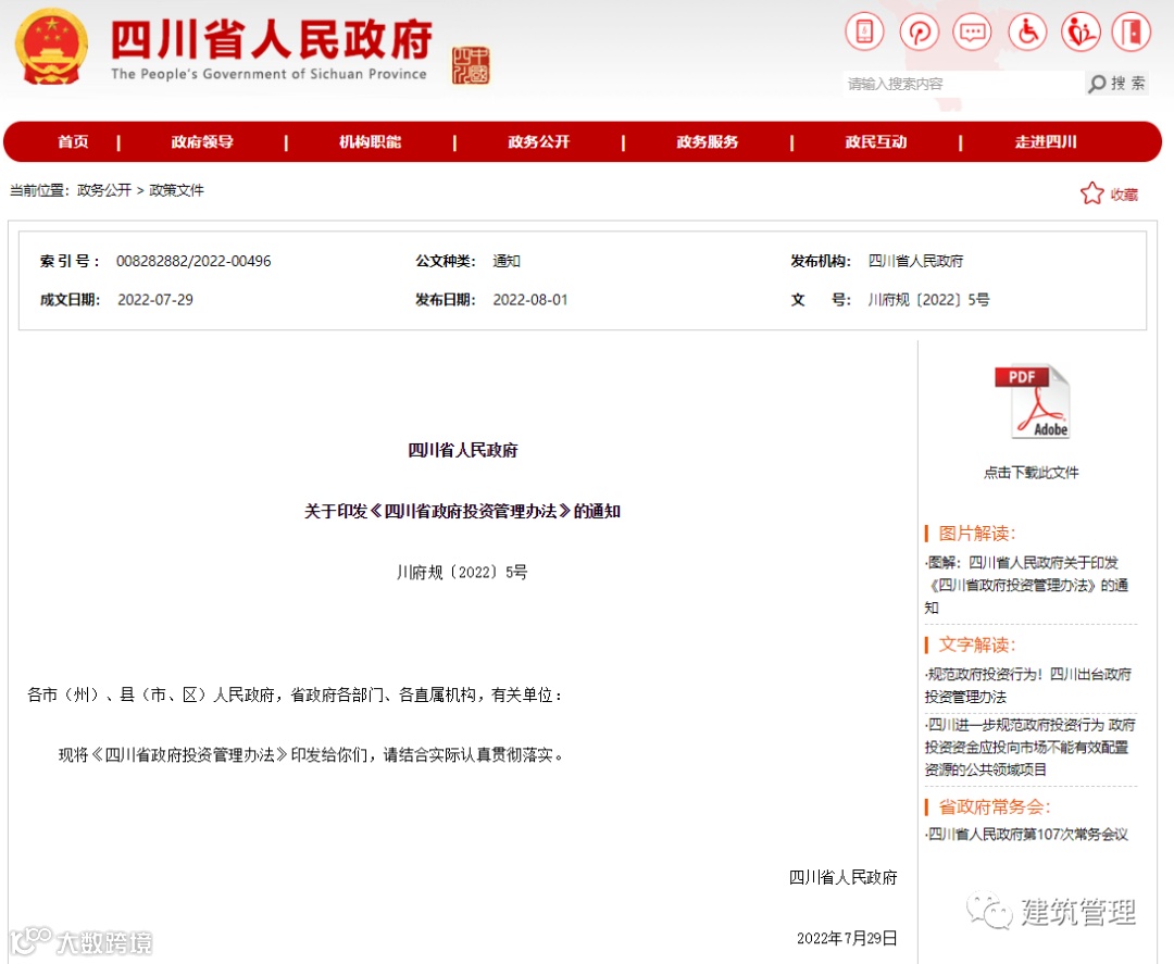 8月1日,四川省政府正式出台《四川省政府投资管理办法》,本办法自2022年10月1日起施行。