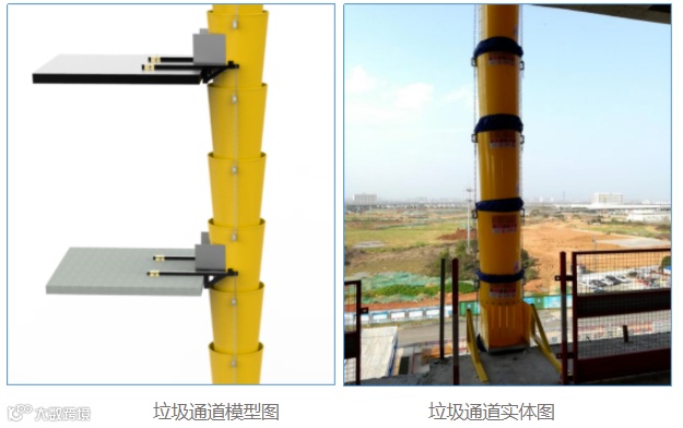 圾通道减少了施工电梯负荷,为材料运输提供了有力保证,提高了工作效率;垃圾通道减少在运输过程中产生的扬尘,对现场安全文明施工起到了良好的改善作用。