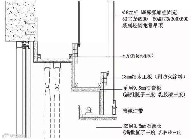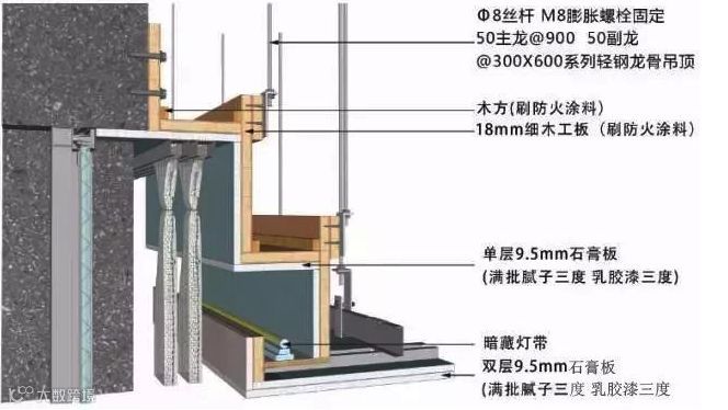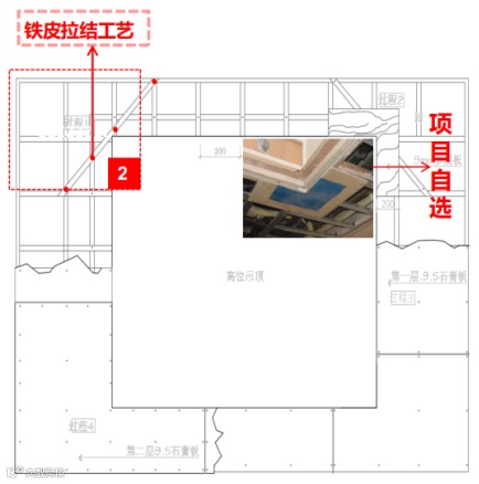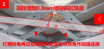 2、叠级吊顶防开裂(有灯带同样要求增加镀锌铁皮拉结)