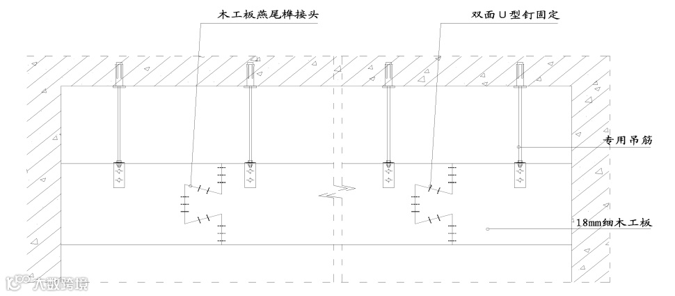吊顶及窗帘箱内非受力平接板均无需进行燕尾榫连接,以上所有设置燕尾榫部位背面需采用细木工板加固,每段搭接长度不小于 200mm,采用自攻螺丝固定。