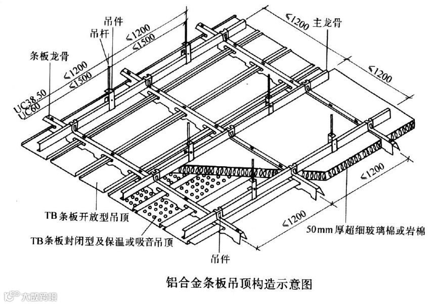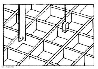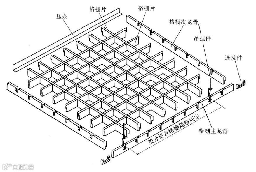 吊顶龙骨架由主龙骨、覆面次龙骨、横撑龙骨及相关组合件、固结材料等连接而成。