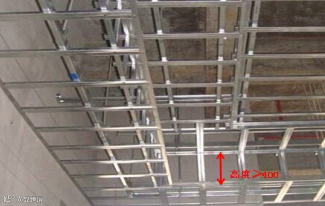 04、吊顶高位空间不够的位置可以采用卡式加强型主龙骨施工,卡式轻钢龙骨(间距不大于 600mm)膨胀螺栓固定,安装副龙骨(间距 400mm)。