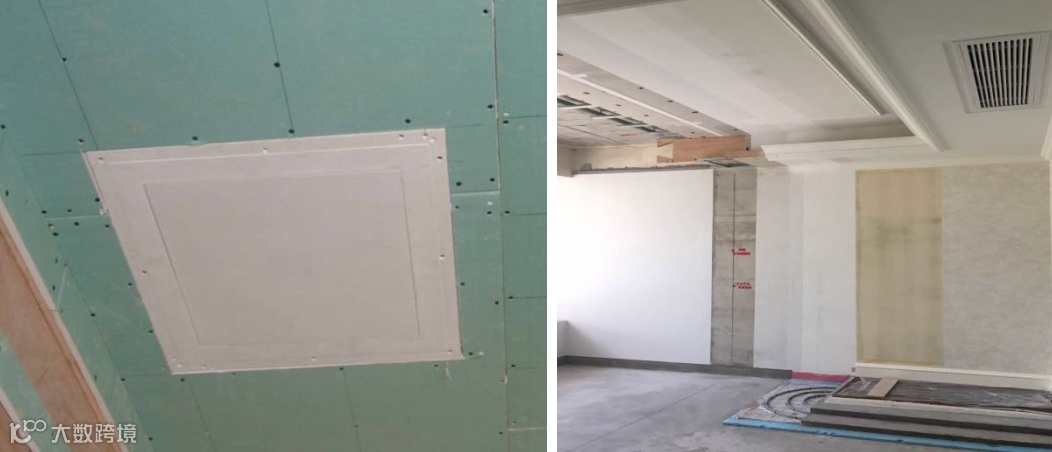 天花低位封板部分的天花灯孔、风口及设备检修孔洞需全部开好,成品检查口需安装一个样板。