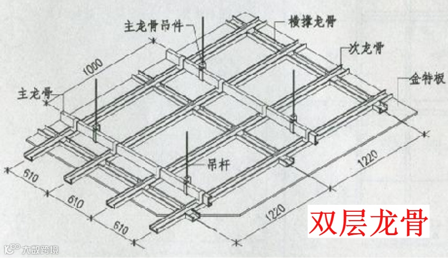 主龙骨是起主干作用的龙骨,是吊顶龙骨体系中主要的受力构件。次龙骨的主要作用是固定饰面板,为龙骨体系中的构造龙骨。