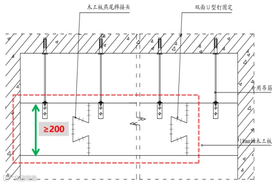 跌级吊顶侧挂板高度≥ 200mm 时,应设置燕尾榫。