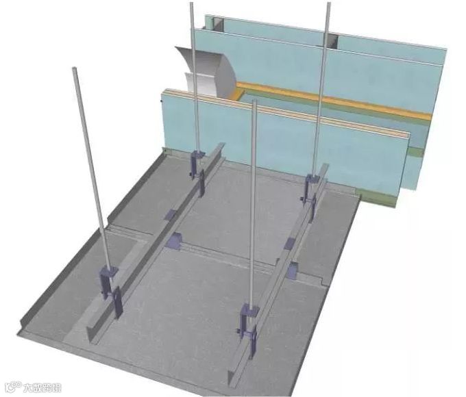 01、采用 50 系主龙骨,壁厚为 1.2mm,安装间距不大于 900mm;副龙骨为 50 系列,壁厚为 0.5mm,安装中心间距 300mm。