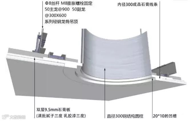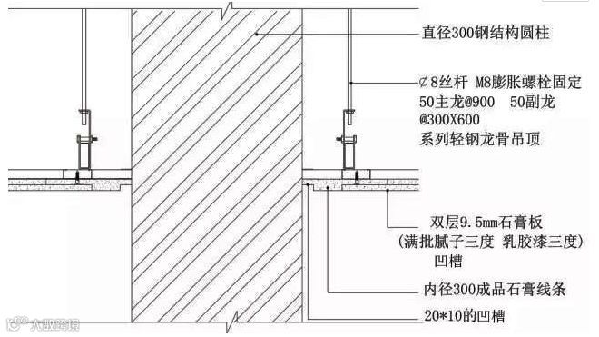 01、吊顶高位处如设计做法为封双层 9.5mm 纸面石膏板,轻钢龙骨副龙骨需安装成单向中心间距 300mm,石膏板拼缝处设置横撑龙骨。