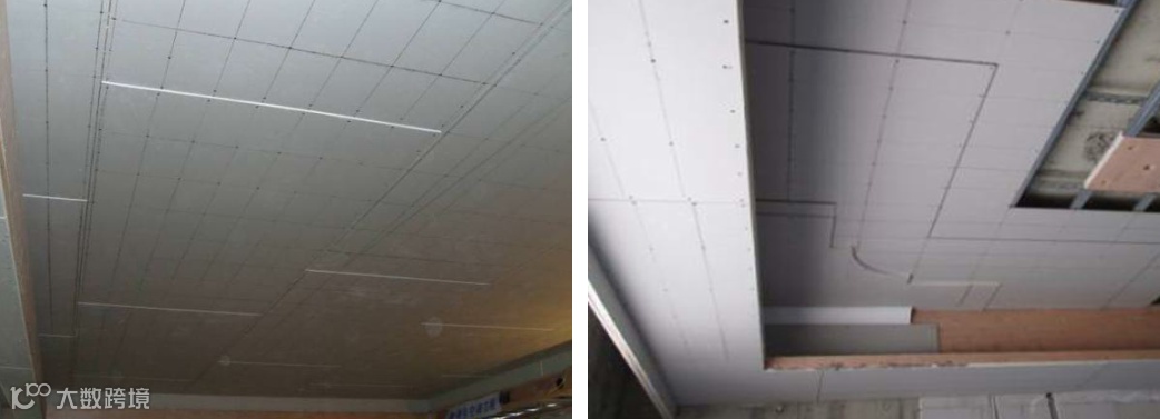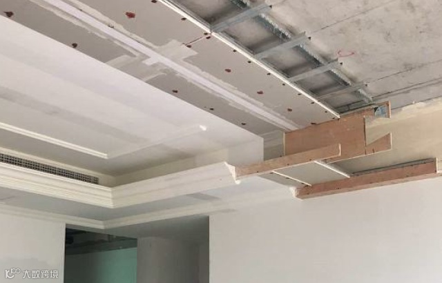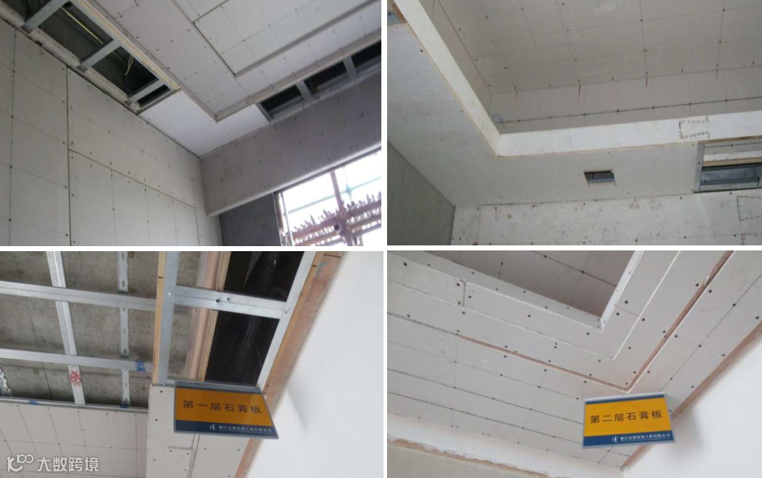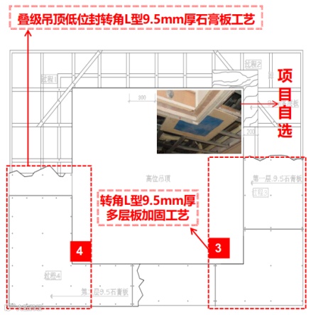 01、吊顶转角处面层(第二层)需采用整张石膏板裁成 L 形,两端长于第一层基层板各 300mm,面层与第一层多层板及第二层板的夹层间均要求满涂白胶,自攻螺丝固定。