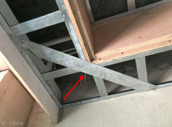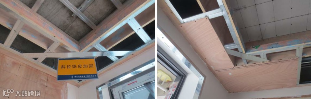 01、叠级式吊顶低位的转角部位副龙骨面采用 0.8mm 厚,40mm 宽镀锌铁皮斜拉加固,减少吊顶转角位开裂风险。
