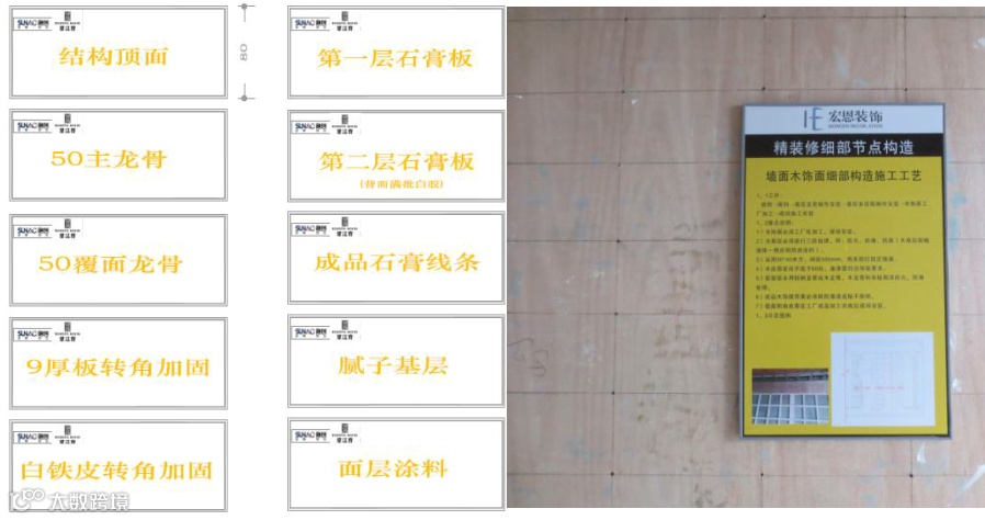 工艺说明、工艺大样图、各工序标牌;展示牌采用 TK 板制作,尺寸统一为 200*80,采用双面胶固定在实体样板层上。