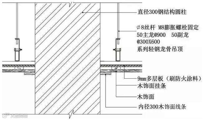 01、天花高位有挂装饰灯的位置需加固处理,采用双层 18mm 多层板,400mm*400mm,用 4 根吊杆直接吊挂在结构楼板上。