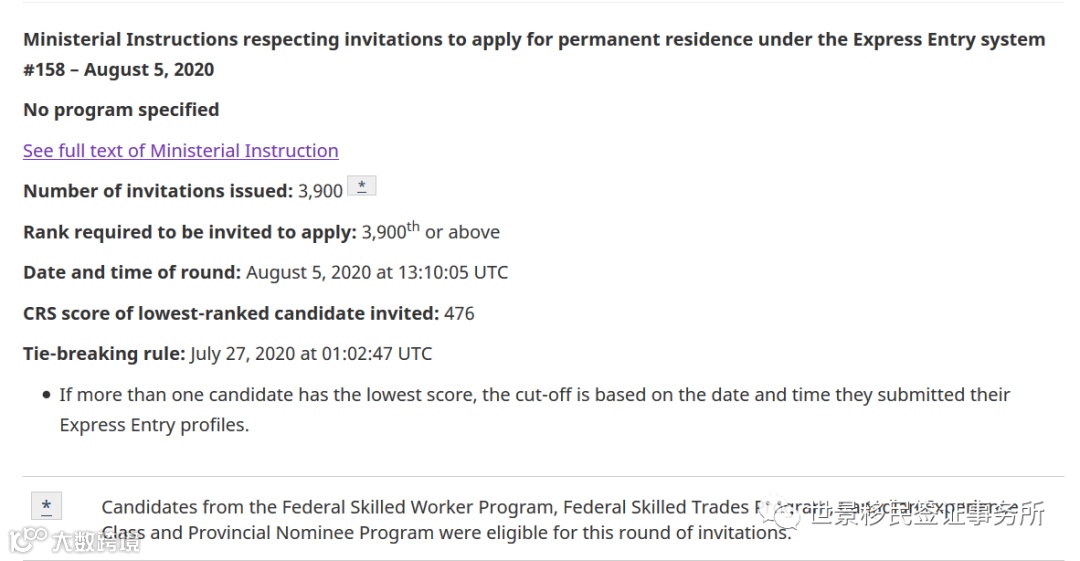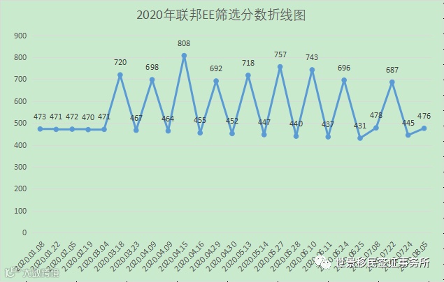 加拿大时间2020年8月5日,EE进行了最新一次加拿大技术移民筛选,本次筛选不分类别,获邀最低分为476分,获邀人数为3900。