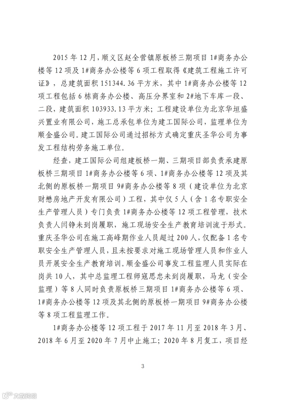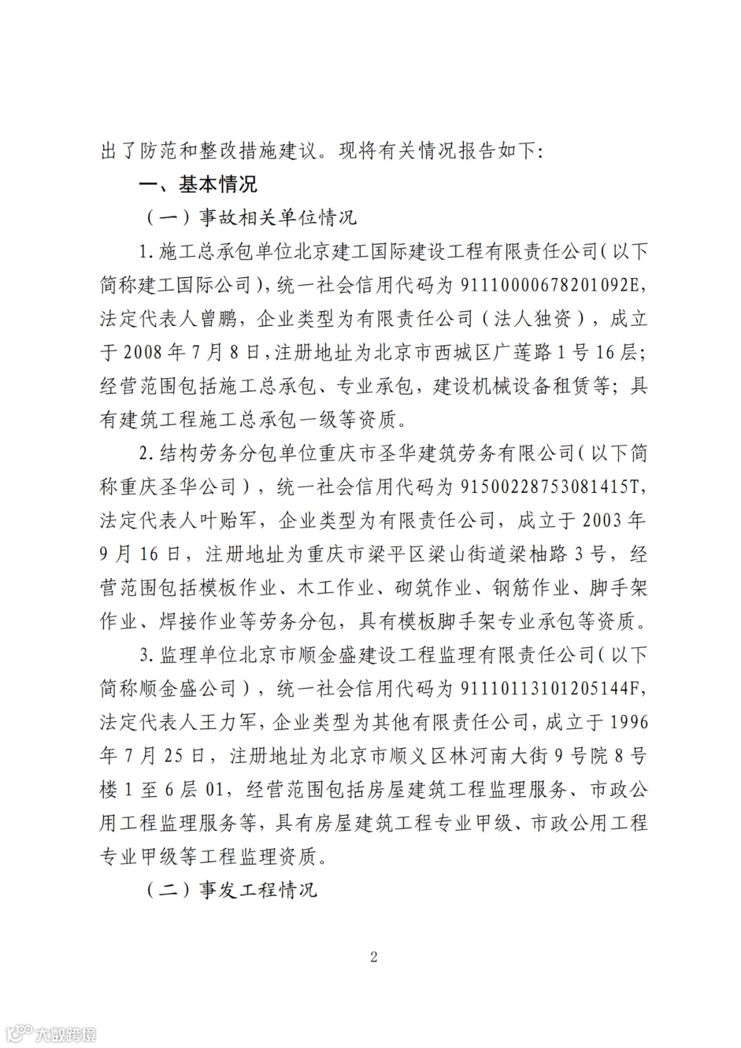 事发工程建设单位为北京华垣盛兴置业有限公司,施工总承包单位为北京建工国际建设工程有限责任公司(以下简称建工国际公司),监理单位为北京市顺金盛建设工程监理有限责任公司(以下简称顺金盛公司),结构劳务施工单位为重庆市圣华建筑劳务有限公司(以下简称重庆圣华公司)。