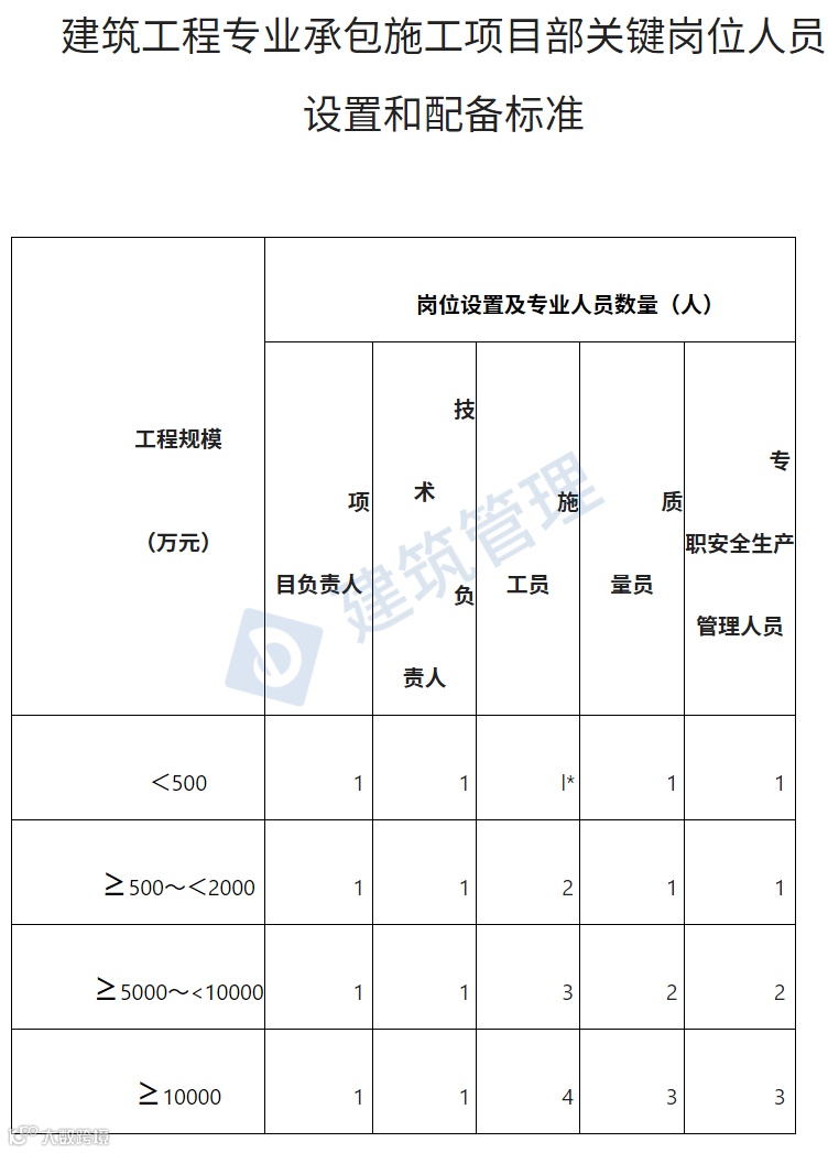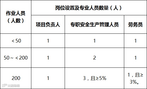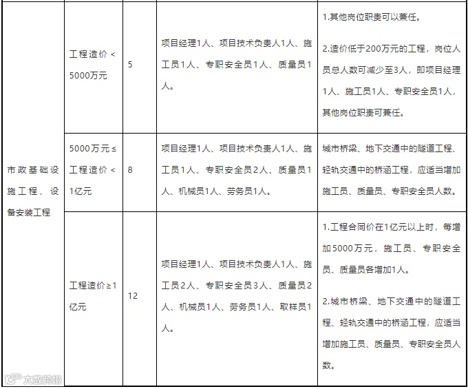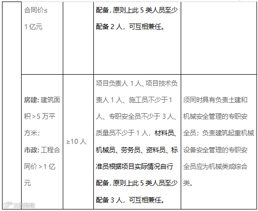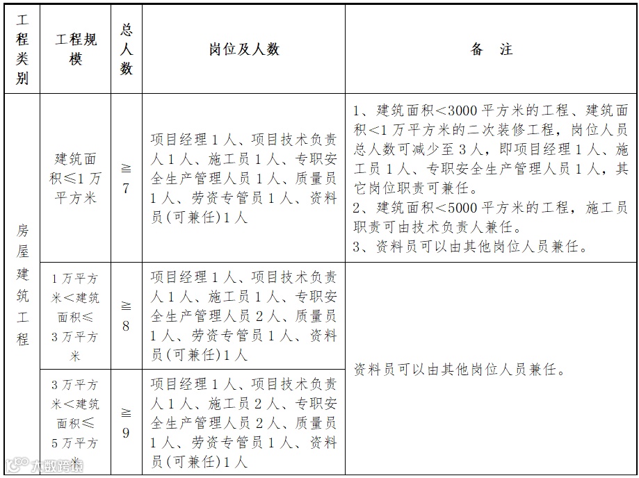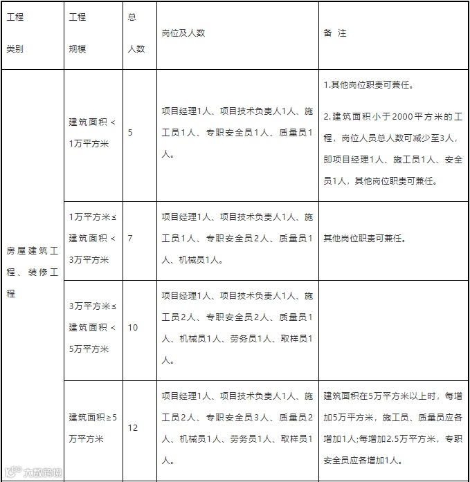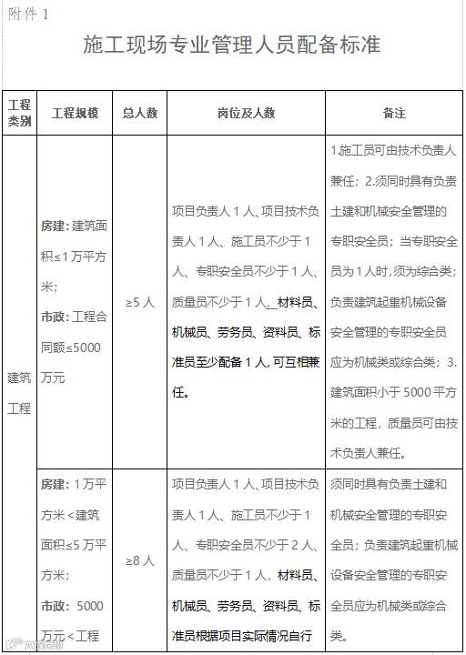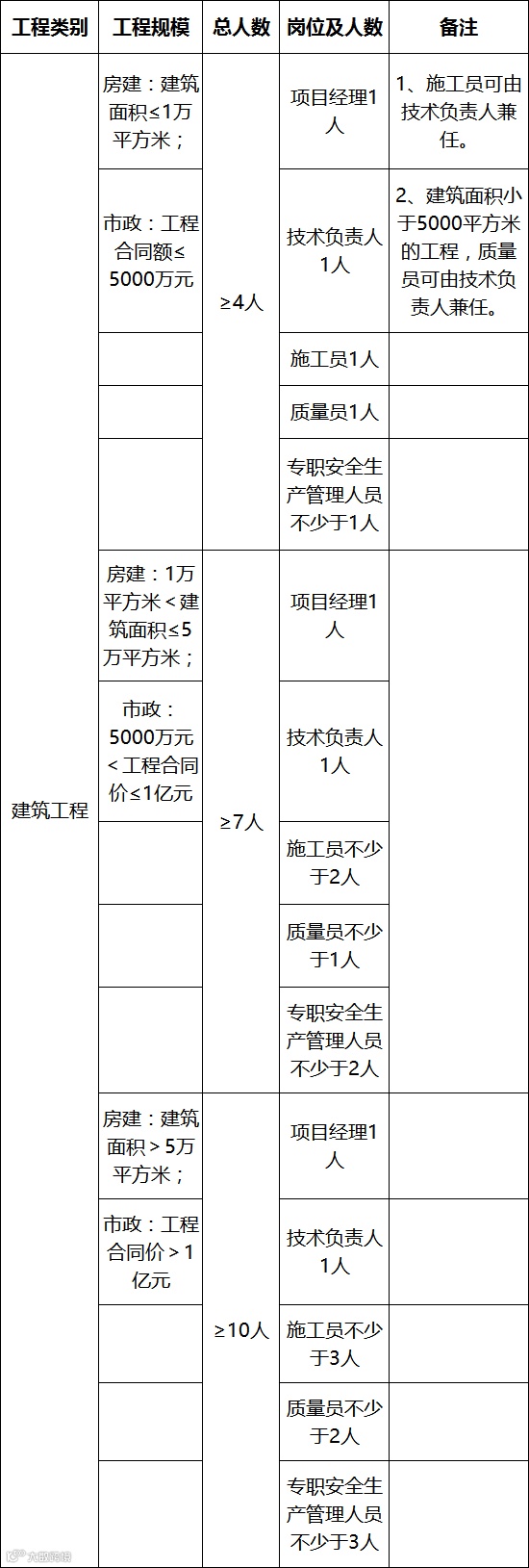 注:1.此标准为关键岗位人员最低配备标准,施工企业应当根据工程项目施工实际工作需要配备人员。