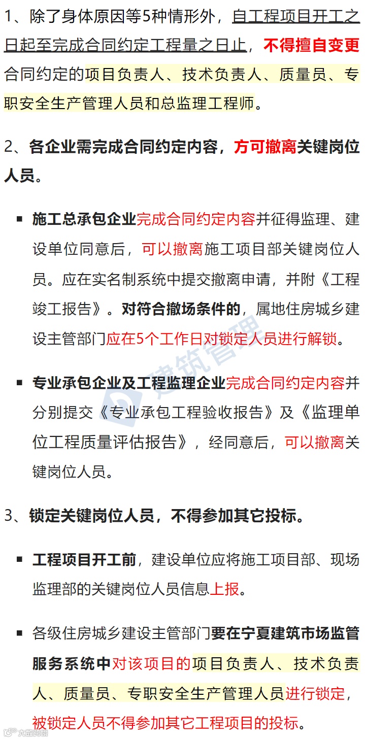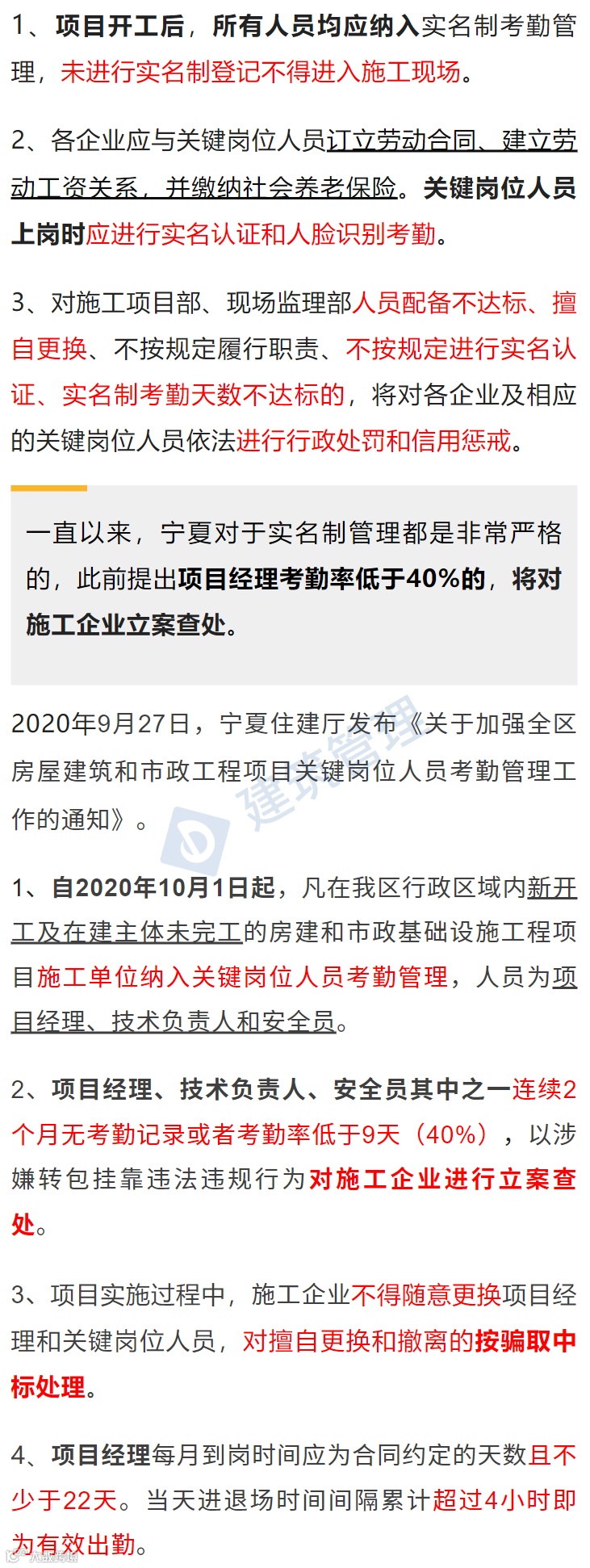 4月15日,宁夏住建厅正式发布关于印发《宁夏回族自治区建筑工程施工现场关键岗位人员配备管理办法》的通知,本办法自2022年4月7日起实施。
