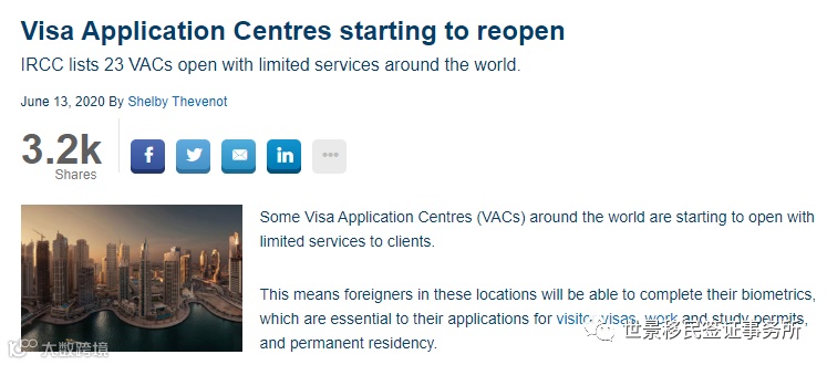 加拿大世界各地的一些签证申请中心(VAC)开始重开向客户提供有限的服务,目前仅限生物信息采集及预约,但对于前往加拿大留学、探亲以及申请移民的人士非常重要。