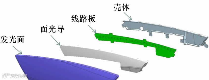 (4)点光源面发光式氛围灯,结构一般由发光面罩 (雕刻特殊发光图案)、面光导、LED线路板 (多光源)、壳体组成,主要应用于仪表板氛围灯、门护板氛围灯等位置。该形式的氛围灯对雕刻工艺要求较高,可实现面发光呼吸效果、 律动效果,点亮后发光效果极佳。但该形式的氛围灯结构设计需求的结构空间较大,且单件成本偏高。点光源面发光式氛围灯结构组成示意见图4。