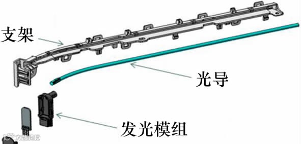 (2)点光源光带式-反射式氛围灯,结构一般由发光模组、光导、安装支架构成,主要应用于门护板氛围灯、仪表板氛围灯、副仪表板氛围灯及天窗氛围灯等。氛围灯开启后,模组LED光源进行发光,光线通过光导进行传递,将光线均匀地照射在承接面上,实现反射式光带发光效果。该形式的氛围灯发光效果一般,发光较均匀,安装方式简单,但发光亮度偏低且实际发光效果易受承接面的角度变化和色泽变化影响,易导致主观评价效果产生较大偏差。点光源光带式-反射式氛围灯结构组成示意见图2。