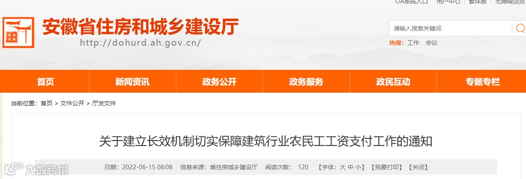 2022年6月15日,安徽省住建厅发布《关于建立长效机制切实保障建筑行业农民工工资支付工作的通知》,自2022年7月1日起施行。明确: