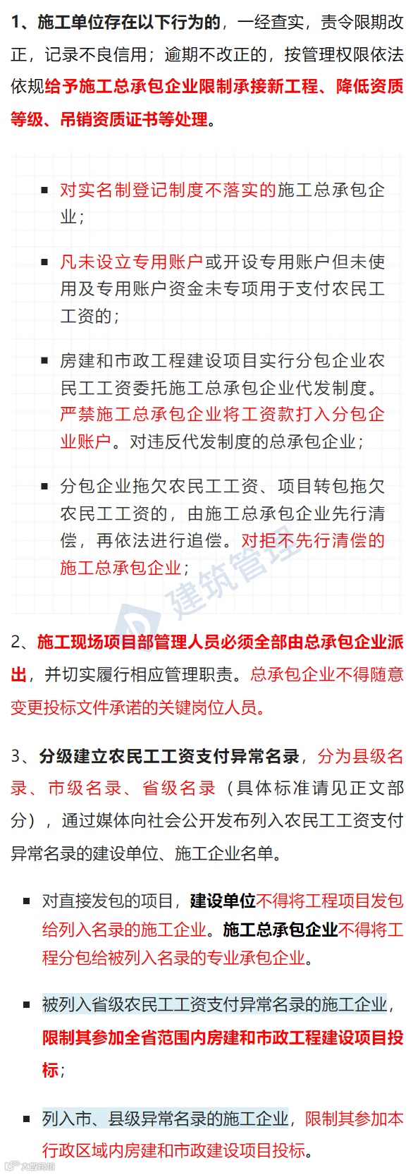 (二)工资专用账户制度。房建和市政工程建设项目开工前,施工总承包企业应在符合条件的商业银行开设农民工工资专用账户,并按监管要求规范工资专用账户名称。施工总承包企业在项目所在地有2个及以上工程项目同时在建的,可开设新的专用账户,也可在符合监管要求的情况下,在已有的专用账户下按项目进行管理。凡未设立专用账户或开设专用账户但未使用及专用账户资金未专项用于支付农民工工资的,一经查实,责令限期改正,记录不良信用;逾期不改正的,按管理权限依法依规给予施工总承包企业限制承接新工程、降低资质等级、吊销资质证书等处理。