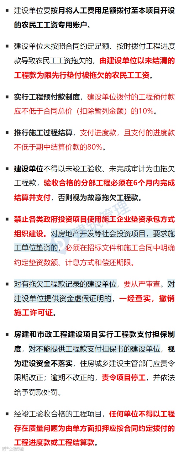 (一)严格建设资金审核。对新建房建和市政工程项目,住房城乡建设主管部门要核实经批准的建设规模和资金落实情况,对建设资金不落实的一律不予办理施工许可、质量安全报监手续;对有拖欠工程款记录的建设单位,要从严审查。对建设单位提供资金虚假证明的,一经查实,撤销施工许可证,责令限期整改,在整改期内不再核发其申请的其他建设项目施工许可证,并通过本部门网站向社会公布。