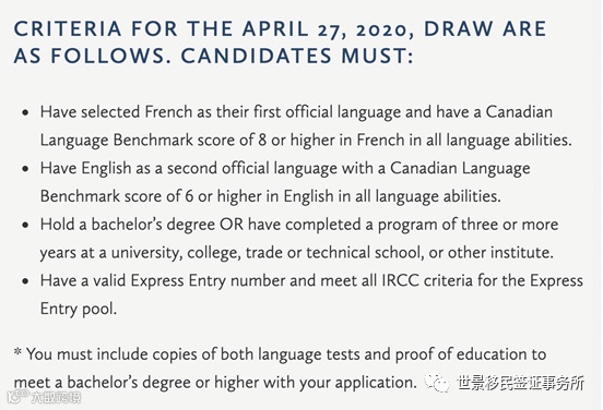 作为新省省提名项目中较为活跃的劳动力市场优先类在4月27日进行了一次抽签。在这一轮邀请中,有法语基础的申请人被新省直接从联邦EE系统中选出。收到邀请的候选人需要一定的法语和英语基础,项目的实际申请门槛其实比魁省要低。