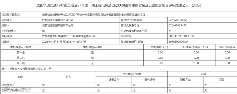 近日,《成都轨道交通8号线二期、13号线一期、10号线三期、17号线二期、18号线三期、30号线一期及轨道交通资阳线工程电梯及自动扶梯设备采购安装及运维服务项目评标结果公示(流标)》发布,根据公告,无中标候选人,8家投标单位全部废标,废标理由各有不同。