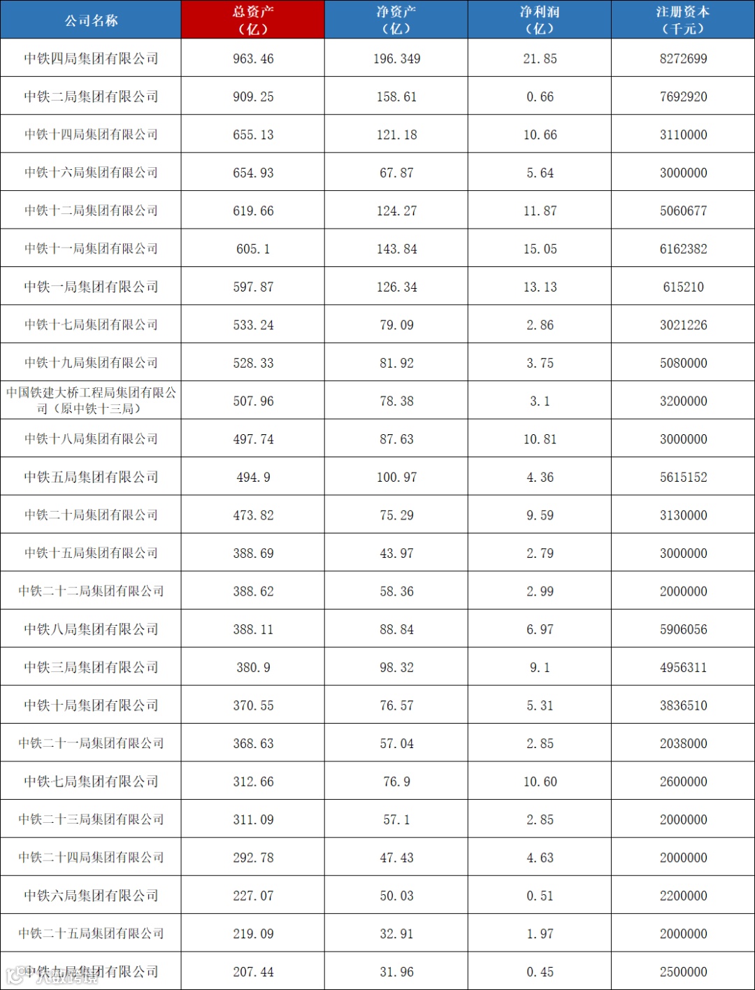 中铁1至25局净资产规模超过100亿有7家工程局,中铁四局净资产为196.34亿元排在第一位,中铁二局以净资产158.61亿元紧随其后。