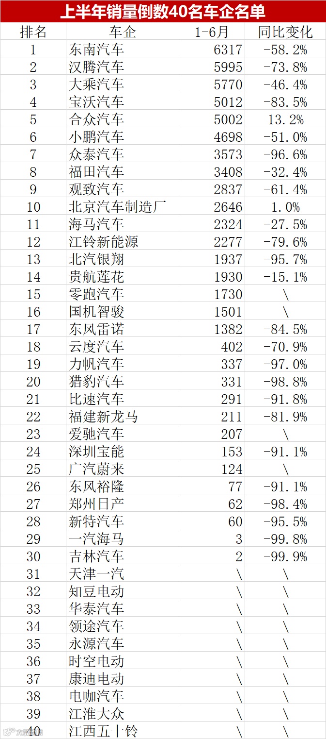 东南汽车位列倒数第四十名,曾是市场受欢迎的三线自主品牌,拥有DX3、DX5等产品,但随着市场竞争加剧与产品力下滑,东南汽车销量也逐步下滑,上半年销量为6317辆,同比下滑58.2%。而有着“众泰血统”的汉腾汽车、大乘汽车也不好过,两家企业上半年销量均不过6千台,降幅分别达73.8%和46.4%。