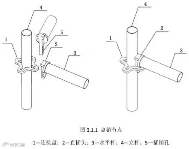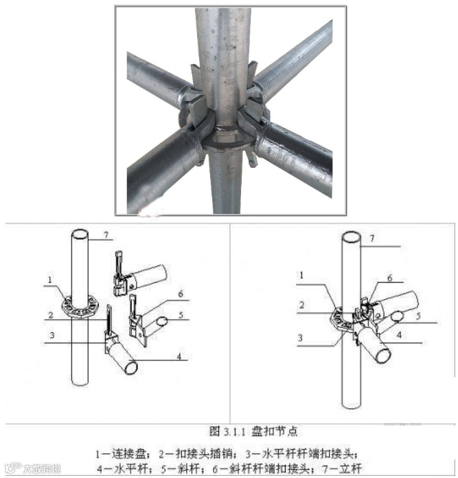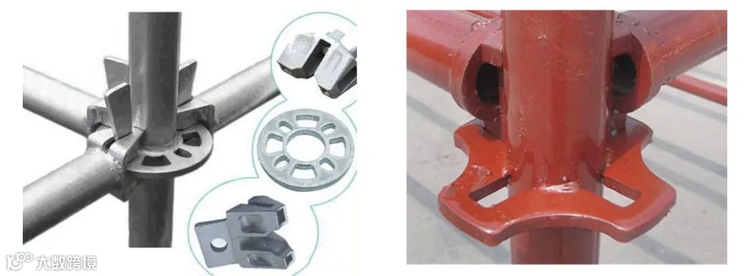 轮扣架:节点连接方式是同轴心承插,节点在框架平面内的连接。