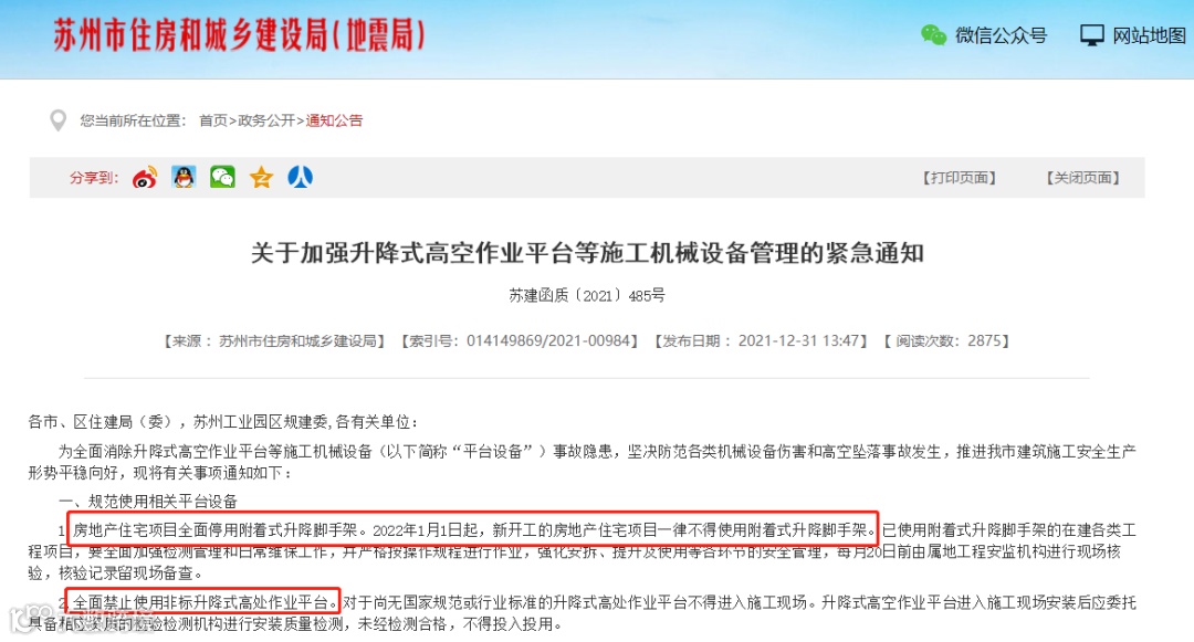 2021年12月31日,苏州市住建局发布《关于加强升降式高空作业平台等施工机械设备管理的紧急通知》: