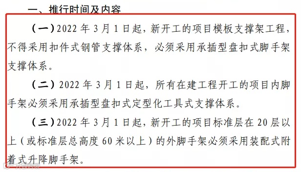 2022年5月1日起,全市范围内房屋建筑工程和市政基础设施工程中,属于危险性较大的混凝土模板支撑体系或其他满堂支撑体系,禁止使用扣件式钢管脚手架和承插型轮扣式支撑体系,必须使用承插型盘扣式等工具式支撑体系。