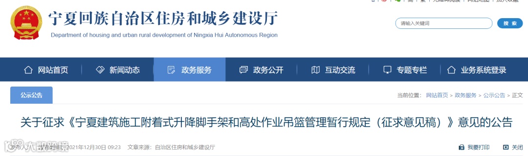 2021年12月30日,宁夏住建厅发布关于征求《宁夏建筑施工附着式升降脚手架和高处作业吊篮管理暂行规定(征求意见稿)》意见的公告。旨在加强全区建筑施工附着式升降脚手架的安全监督管理。
