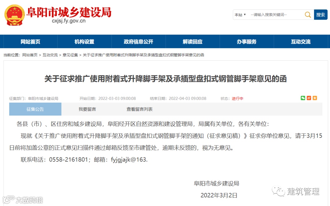 近日,阜阳市住建局发布《关于推广使用附着式升降脚手架及承插型盘扣式钢管脚手架的通知(征求意见稿)》。