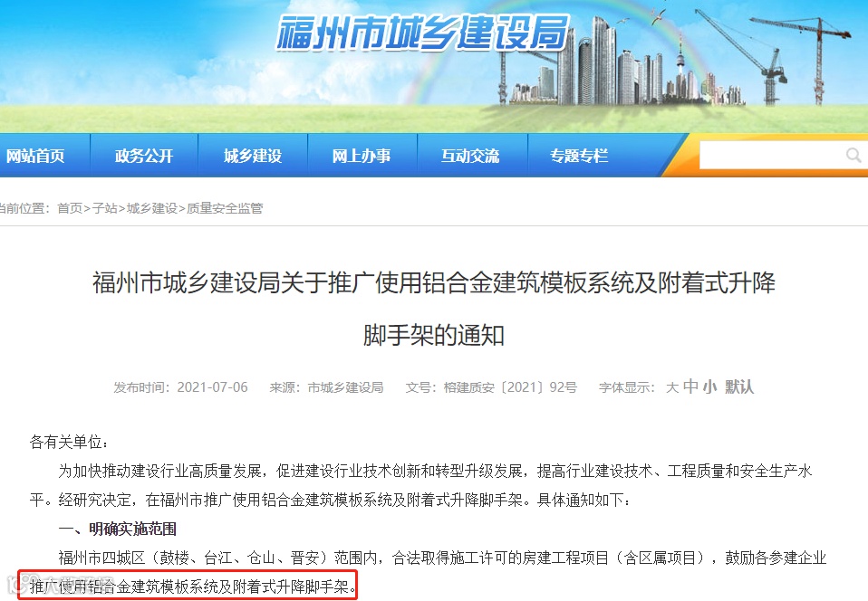 2021年7月6日,福州市城乡建设局发布《关于推广使用铝合金建筑模板系统及附着式升降脚手架的通知》: