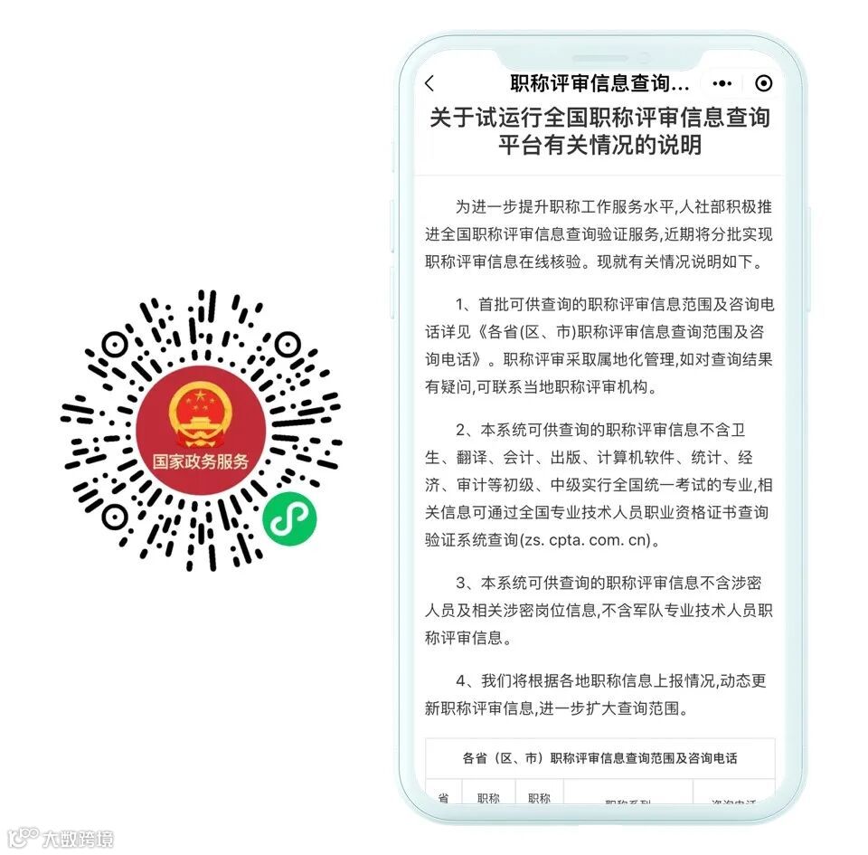 #01:微信搜索“国家政务服务平台”,首页搜索“职称评审信息查询说明”或扫描下方葵花码进入服务,确认个人信息是否在可供查询的职称信息范围内。