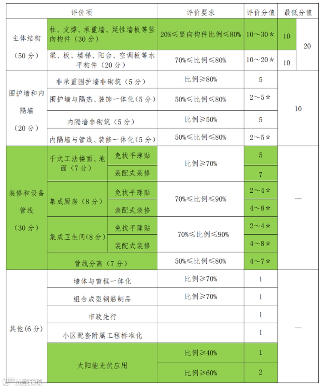 ②针对干式工法、集成厨卫的评分。细化调整为免找平薄贴和装配式装修两种方式,且得分分值也做了调整;