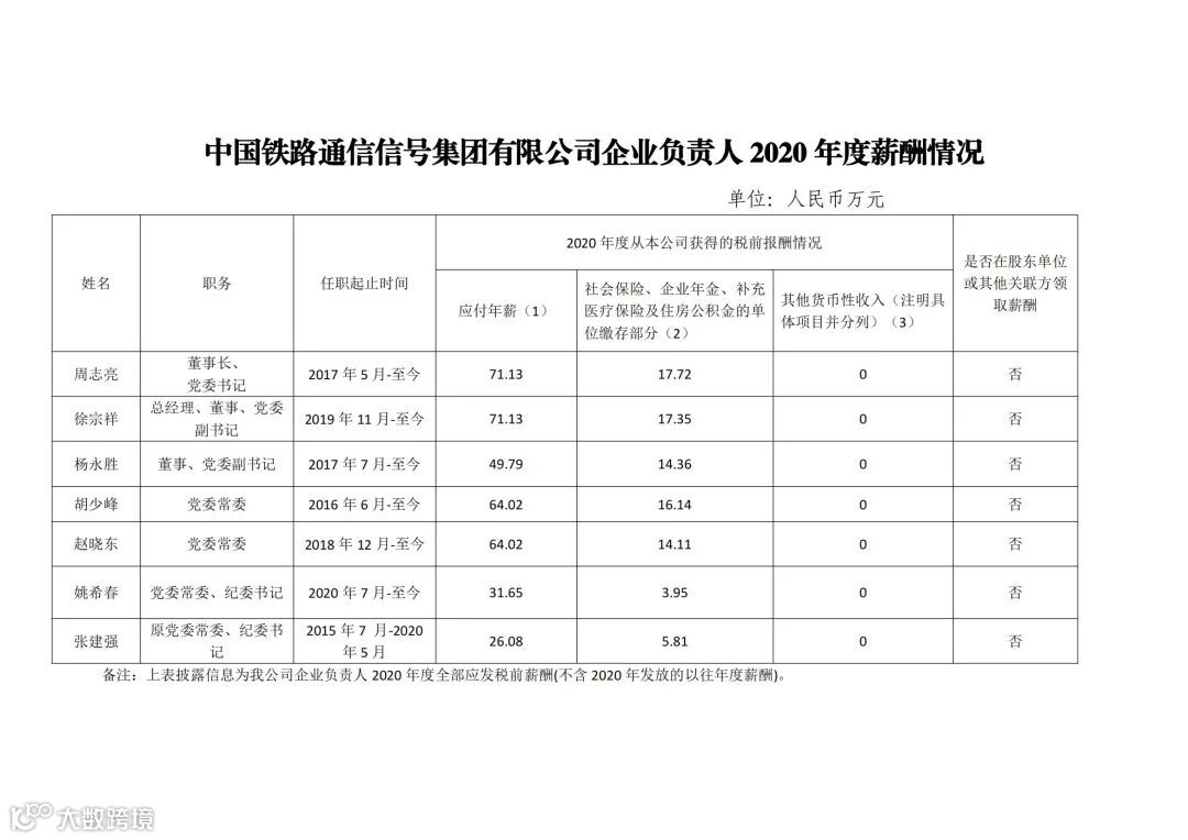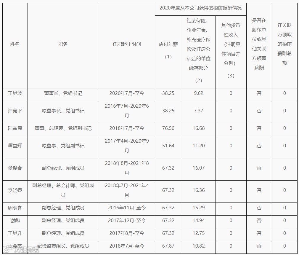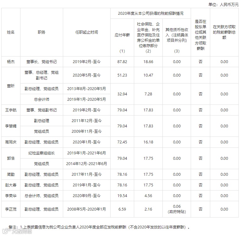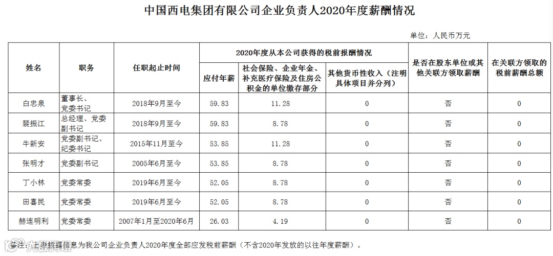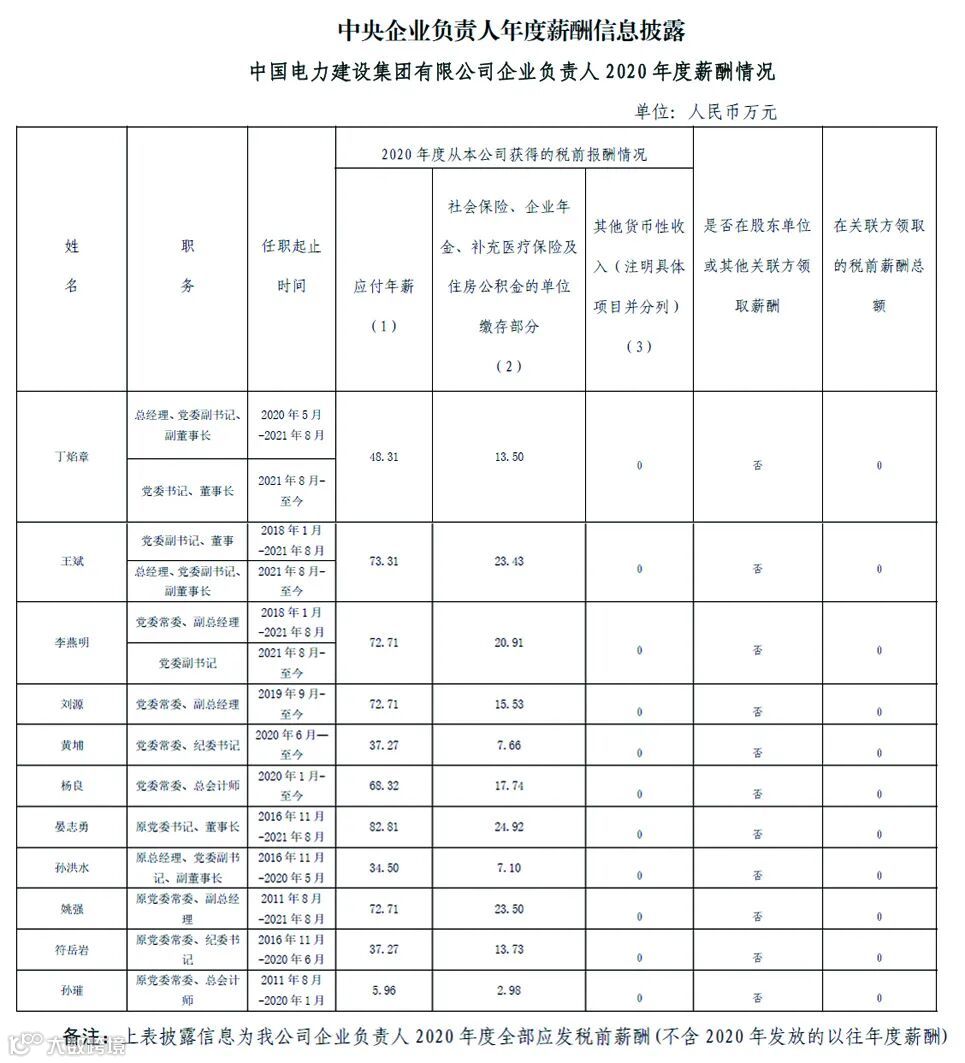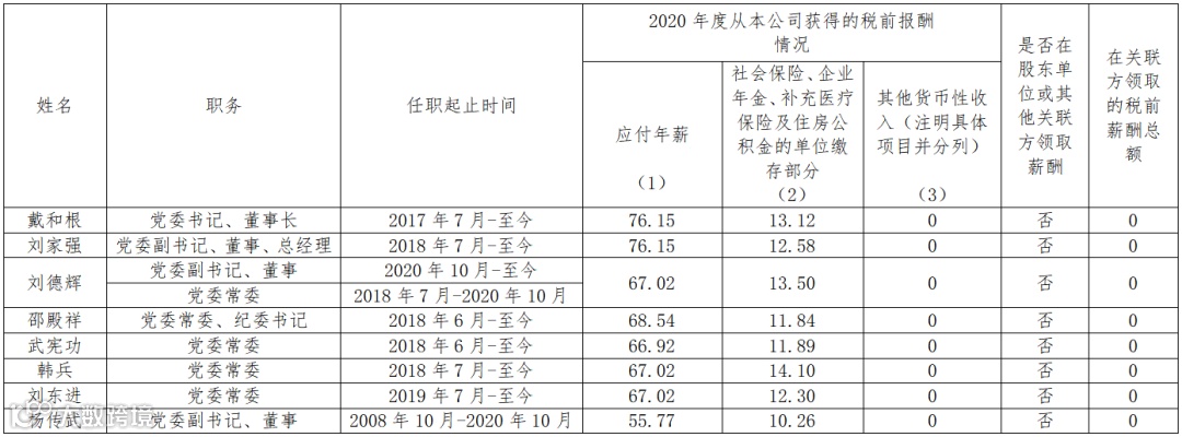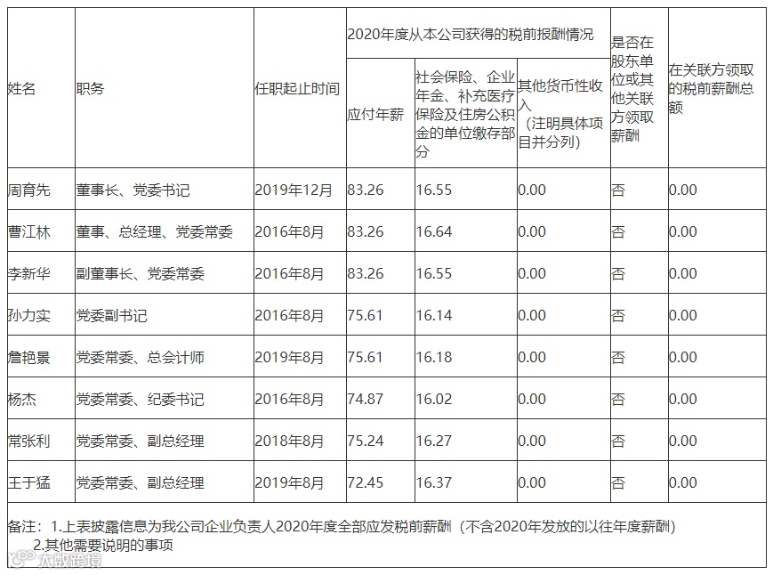 注:如有中央企业一把手在2020年内发生人事变更,该表优先选取2020年内在职时间较长人员。如需了解各中央企业所有负责人2020年度薪酬情况请在下方查看。