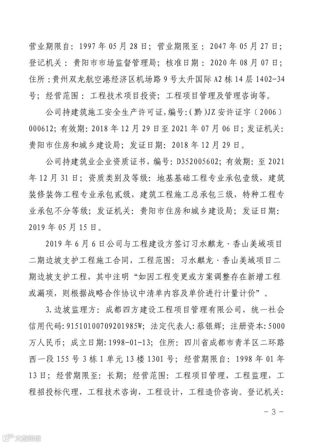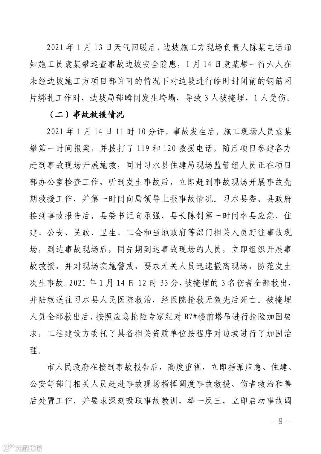 2021年1月14日11时10分许,习水县杉王街道麒龙·香山美域建筑工地发生边坡坍塌事故,先后造成3人死亡、1人受伤。