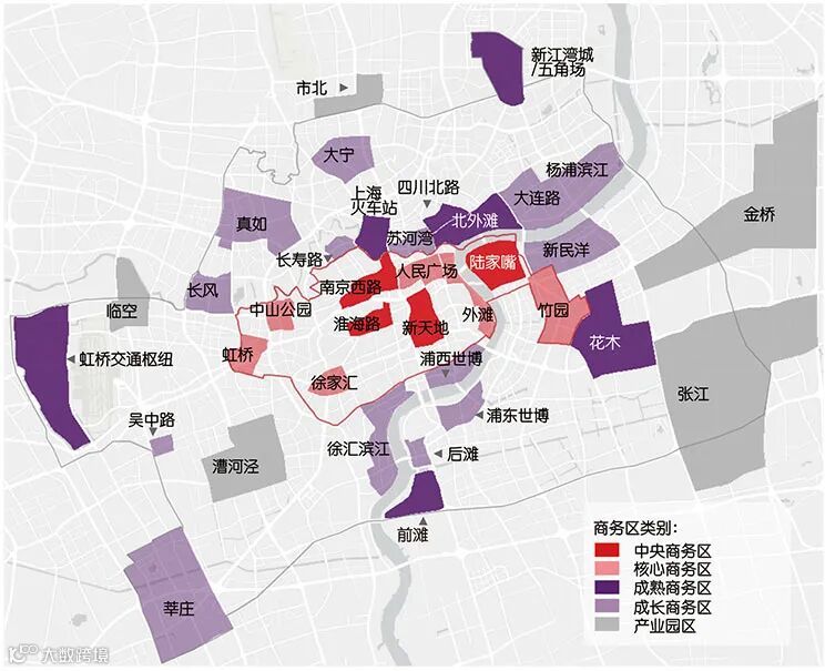 黄浦江将上海市中心为两个区域:浦西(黄浦江以西)和浦东(黄浦江以东)。上海的办公楼市场则可分为中央商务区和快速崛起地集合优质甲级办 公楼的非中央商务区。在城市地铁快速扩张的驱动下,中央商务区和非中央 商务区细分成四个类别:核心商务区、中央商务区、成熟商务区、成长商务区。