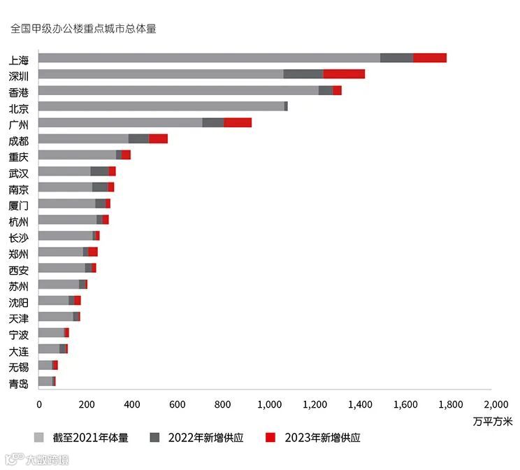 2021年,中国21个重点城市(包含香港)的甲级办公楼总体量录得8,787万平方米,未来两年,21个城市合计将有近2,000万平方米的新增供应,约占目前总体量的22%,其中,深圳、上海、广州、成都的未来供应量较大。