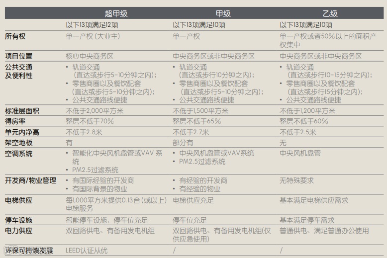 典型的供企业员工办公、从事商业经 营活动、共享功能设施的场所,按建筑和配套质量可分为超甲级、甲级、乙级等多个等级。与服务式办公室和联合办公空间相比,交付后依租户需求可能需要装修且租期较长。